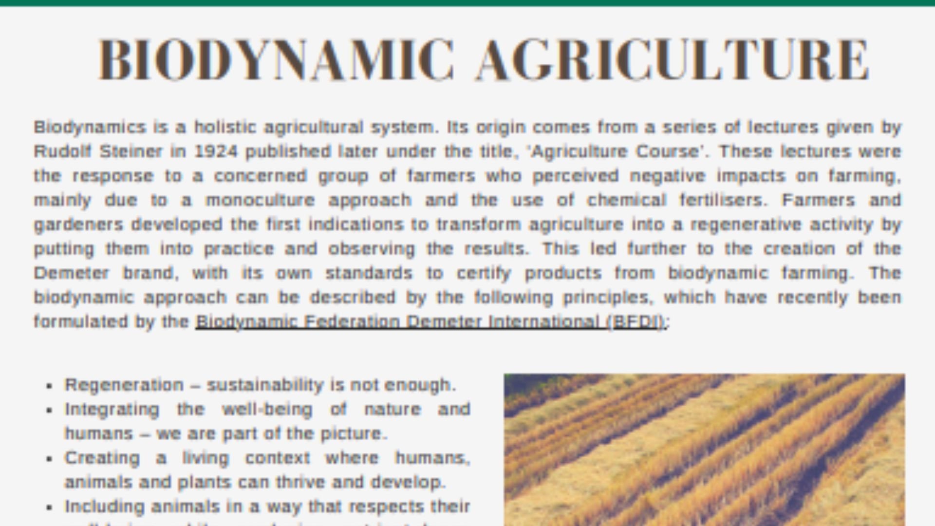 Home Knowledge Fact sheet “Biodynamic Agriculture” July 8, 2024 0 COMMENT 734 Views Fact sheet “Biodynamic Agriculture”